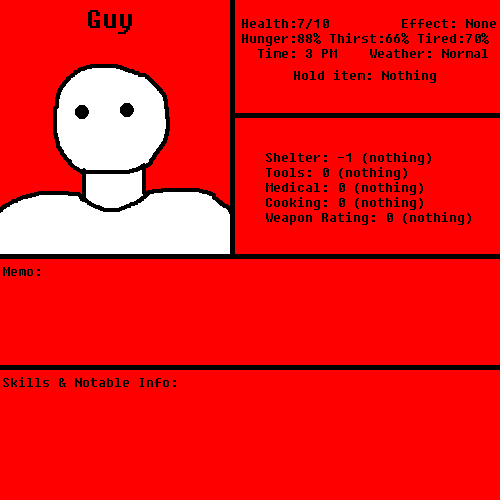 Author note: You can check your inventory and status screen, inventory doesn't matter now, 'cause you have no items stored, carried, or held yet, but status will tell you the state of things, if it's something important. Yknow, stuff like status ailments or how good the tools and shelter are that you have made. Assuming you survive that long...
