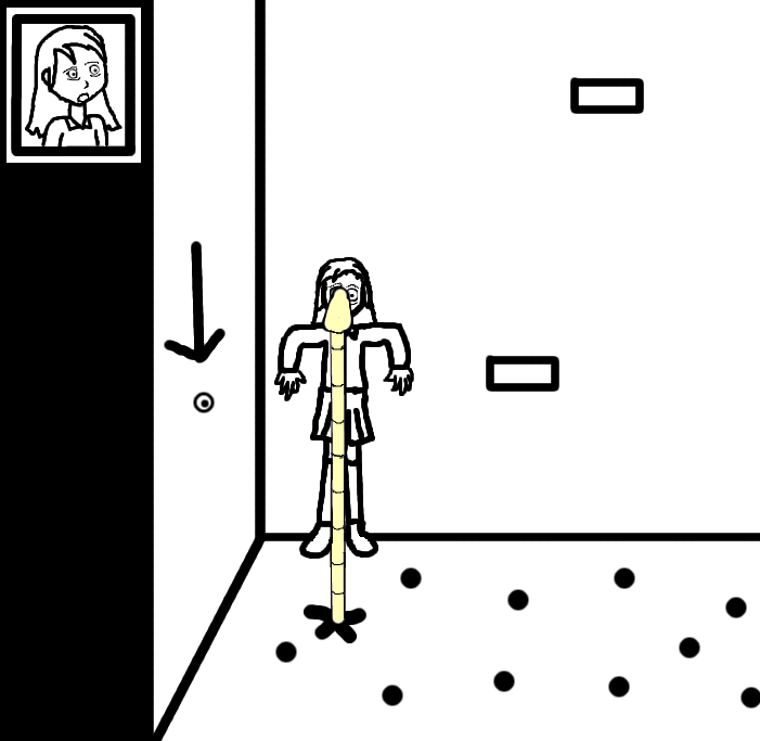 I take a run for it and I manage to squeeze past him! But where do I go? This hall leads to a dead end and a scary door thing!