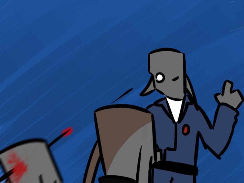 "You got a lousy poker face, friend. No judgement, maybe that's a result of the arrow in your crotch. Now spill the beans," says Aldo, "and we'll rough you up and leave you in the street, and maybe you can make it to a hospital in time to save a couple nickels from your coinpurse. Or, if you don't," he leans in. "We'll patch you up spick and span and send you right on back to Andri, gift-wrapped. I wonder what he'll do when he finds out you failed."