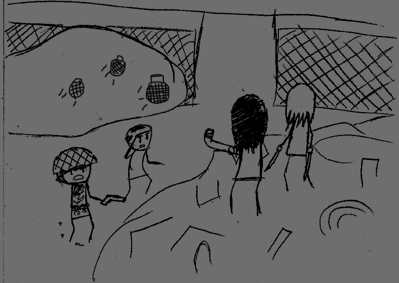 Now, the other thing I need to tell you is that I've found another shadow. It's a guy, all dressed up in military garb. He's got a pistol, a big one, but he doesn't ever use it. He's got what looks to be an unlimited supply of grenades. I approached him, but he just screamed, 'HOSTILE, HOSTILE!' and chucked those things like no tomorrow. He chased me into the junkyard, and now I've been hiding from him. He might be nearby though." The shadow nods, then hangs his head.