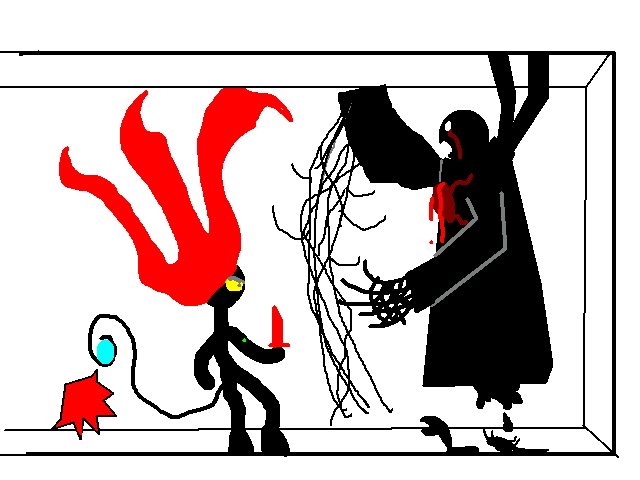 I spear him through the face with my collected blood, and he falls over dead.