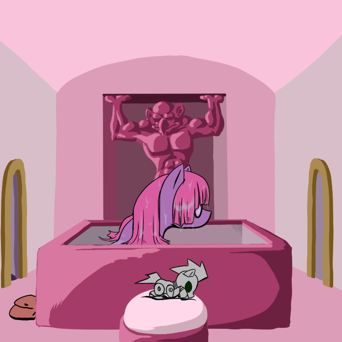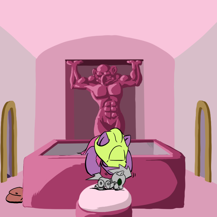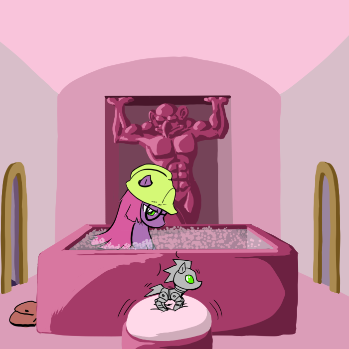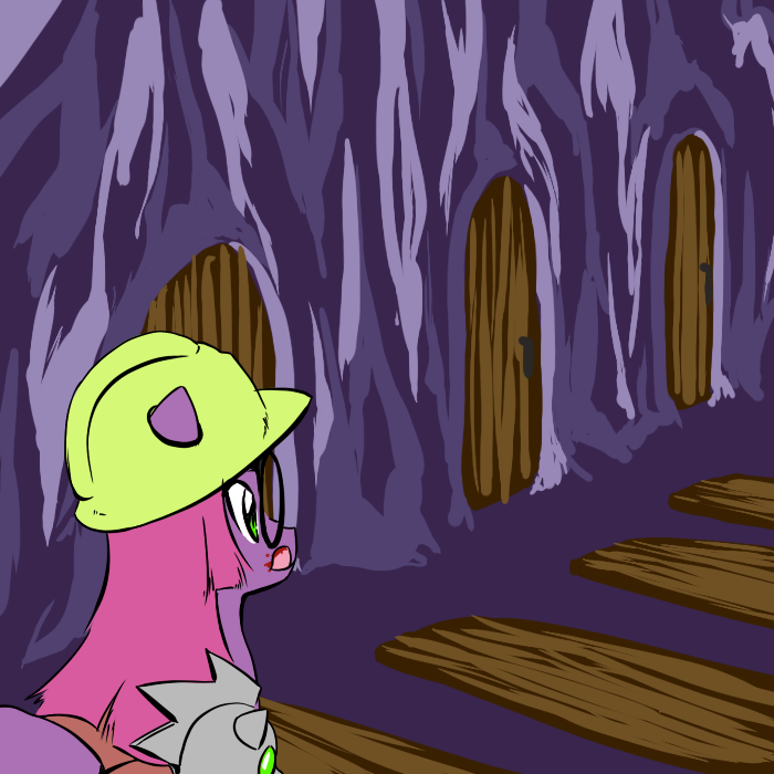 I climb back down and pick Hug Box up with my mouth, and place him inside one of my saddlebags, then scramble back up to the cave. I head down the corridor through an open door.