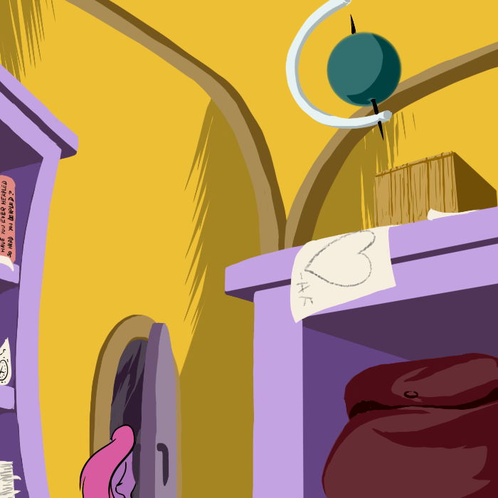 I climb back down and pick Hug Box up with my mouth, and place him inside one of my saddlebags, then scramble back up to the cave. I head down the corridor through an open door.