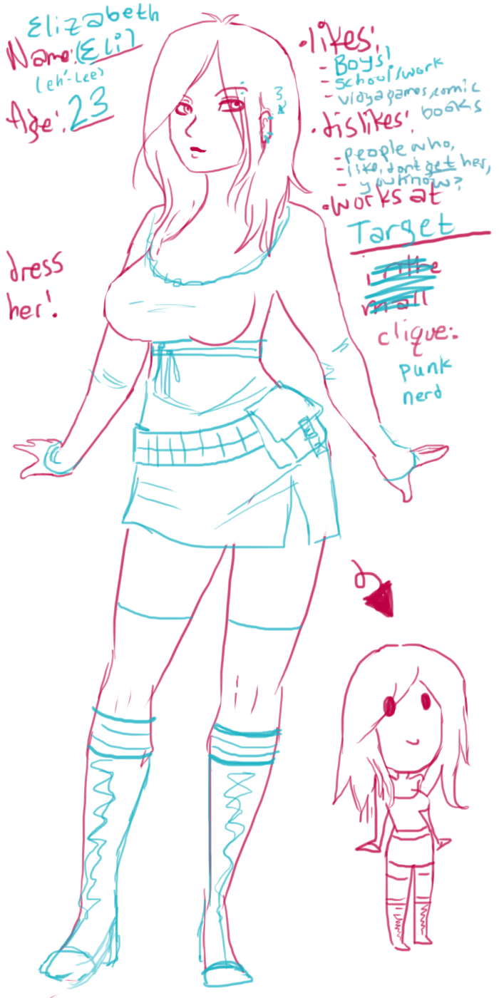 Alright, here's the basic breakdown. There's more to Eli than we've gone through. Eli just got off her shitty shift at Target and was thinking of going to the mall, the movies, or some other social area where she can try to find her other nerdy friends