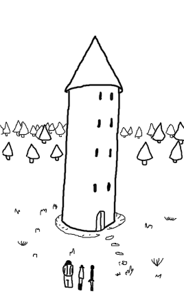 While you're still deciding exactly how to proceed, an immediate glance at the surrounding area shows a 75 foot clearing around the tower, after which pine trees start to appear, growing more dense the further you look. The "clearing" is only a clearing in comparison - it's a mess of short shrubs and tall grass. Hidden underneath it is a simple stone walkway leading to the tower's door.