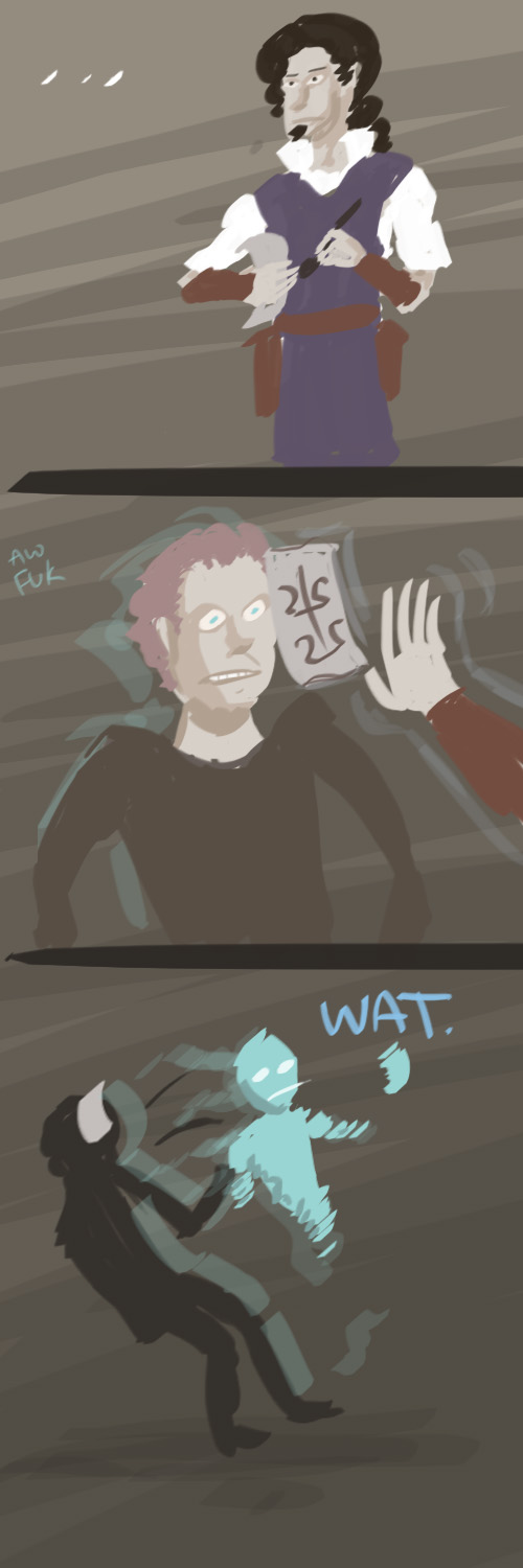 John Casper is looking pretty suave. For a dead guy with a chunk of finger missing. He is in his nicest garments, as if he were about to hit up the fanciest shindig in the afterlife. Like any good kleptomaniac hero, you search his person and locate a gold ring with the Casper family crest and a lovely silver pocket watch.