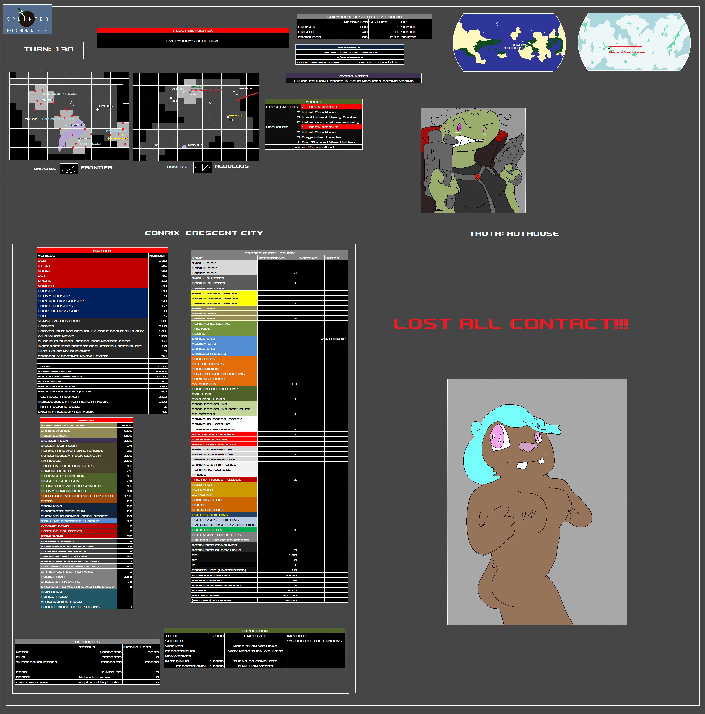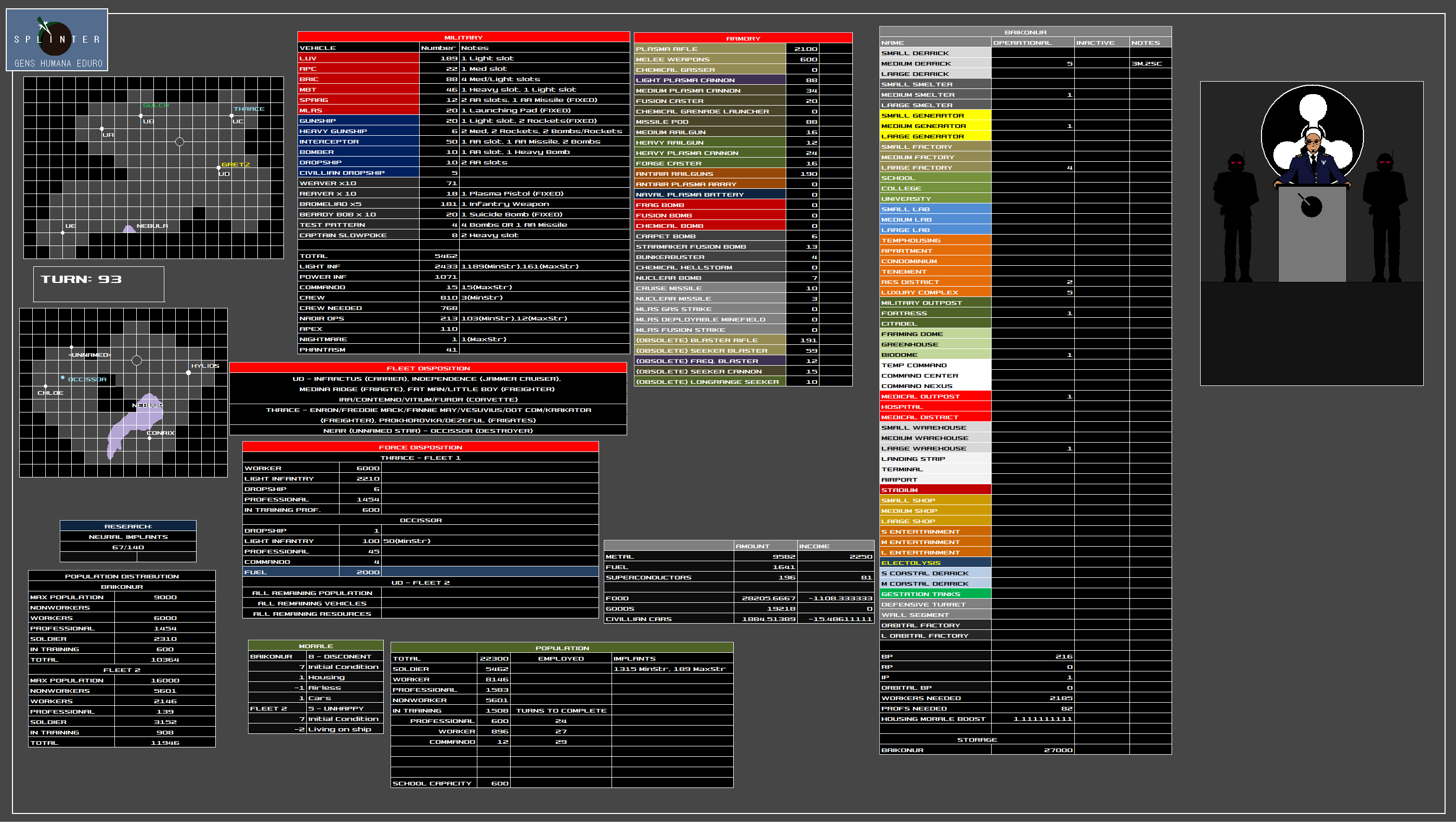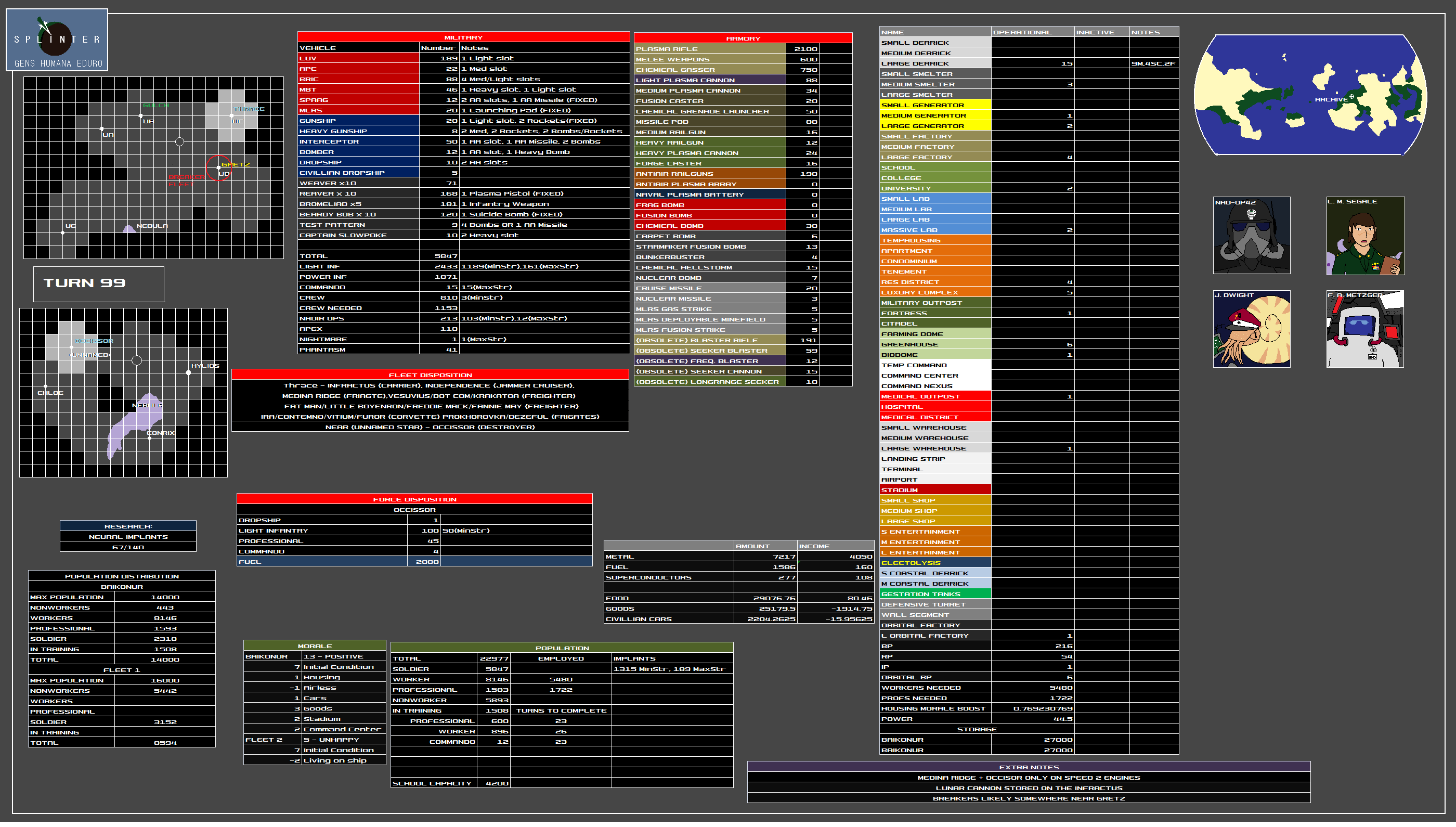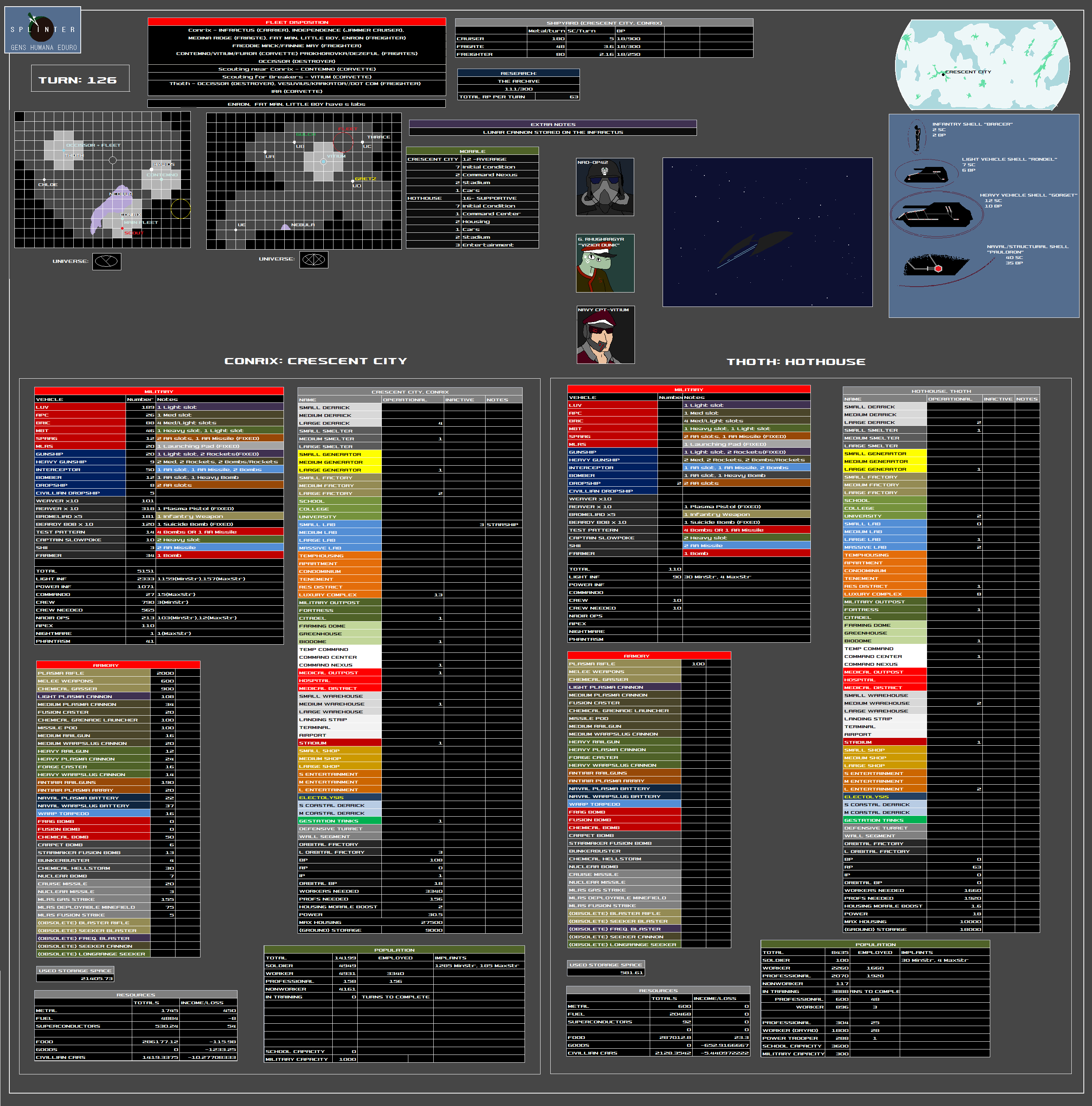 The Naval Directorate of Intelligence and Reconnaissance (NADIR) existed before the formation of the Splinter, acting as a information gathering agency much like the CIA of the 20th to 21st centuries. Director Hector Karras has tirelessly led this organization for many years now, conducting census information, maintaining public order and gathering and organizing data obtained from every source imaginable. Karras has a variety of underhanded tactics in mind to help the Splinter combat its enemies. He is famously quoted in saying that "Mankind no longer has the resources to fight fair."