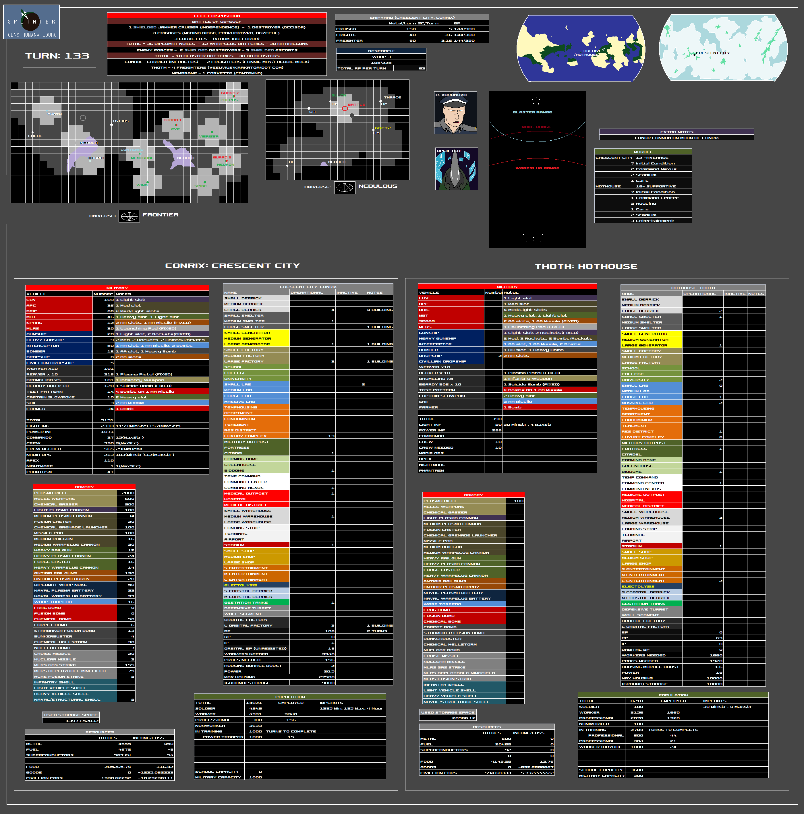 Wing Commander Radomir Voronova is the Splinter's most distinguished pilot. He first demonstrated his courage and skill by engaging and distracting Breaker fighters above Earth, enabling several dropships to escape to the Infractus. He has excellent sense when it comes to starship and aircraft battles, and would have likely been promoted to a much higher rank if he didn't refuse the promotion offers. He feels that ground combat is unwise and wasteful. His belief is that mankind remains completely mobile to avoid unnecessary combat. When combat becomes necessary, his belief is to respond from a safe distance with an unrelenting storm of nuclear ordinance.