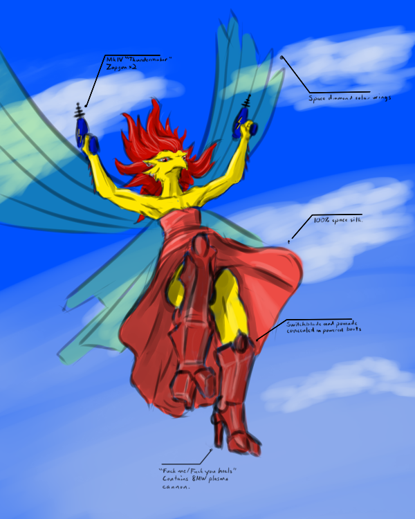 Glitterbolt says we should try making some friends before we try confronting any evil wizards. Also that my dress looks much too formal. Also that it's complete bullshit that she has to carry all my crap.