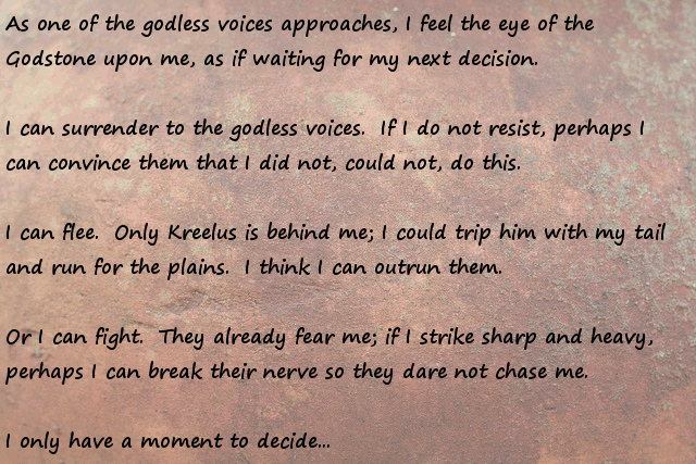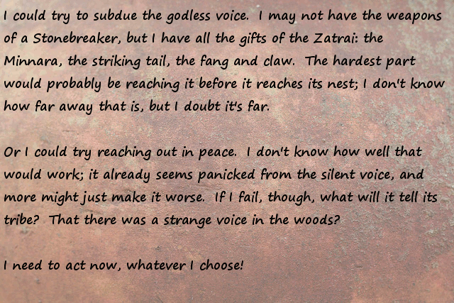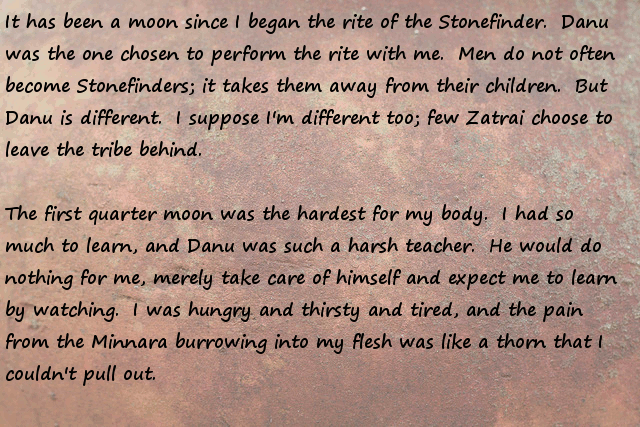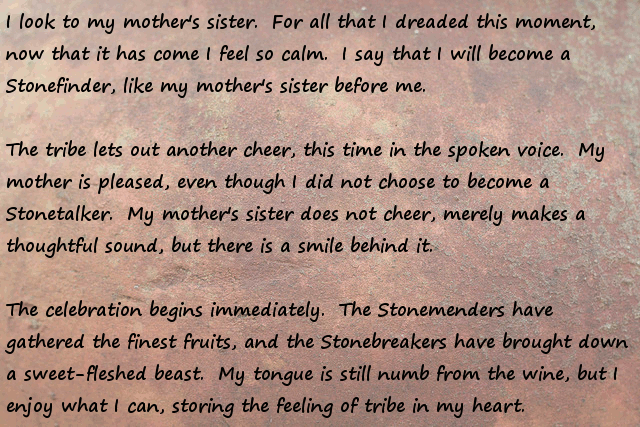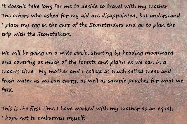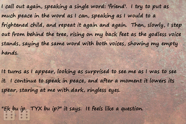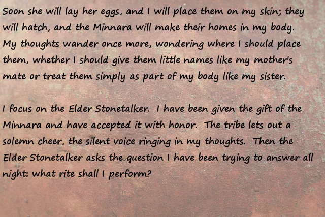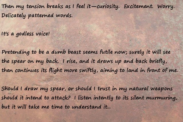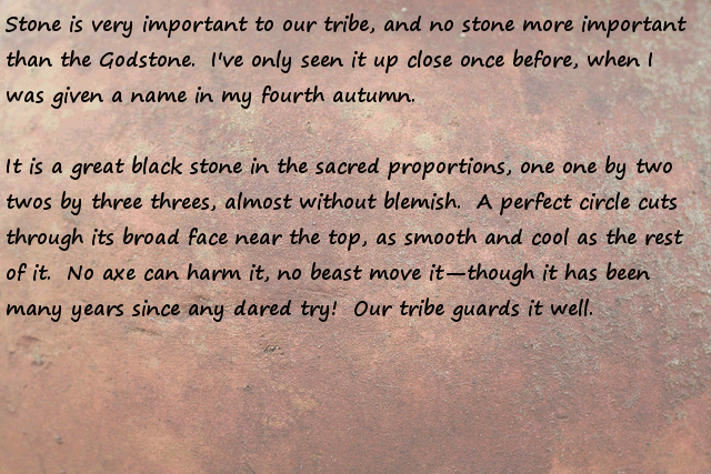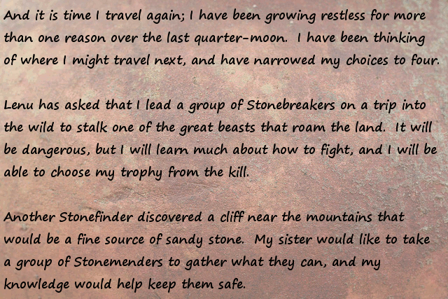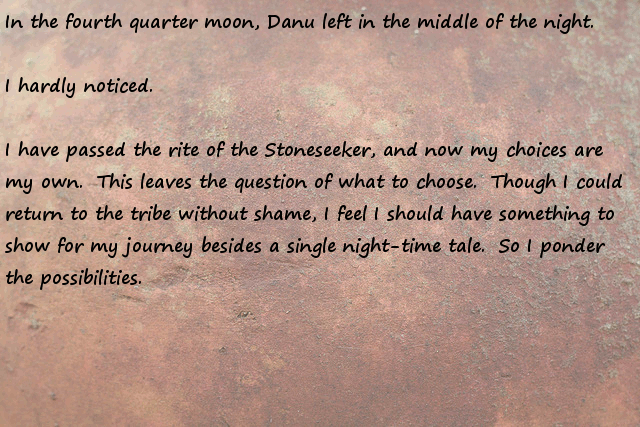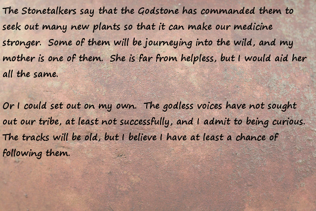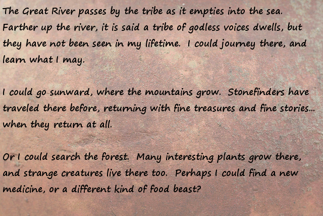 Stonefinder = Is less interesting then I first though, we are talking about finding rare animals and plants for the tribe to cultivate and maybe rare ores... The demon... I bet that is an opposing race of aliens to the ones who gave you the monolith. Still has great potential...