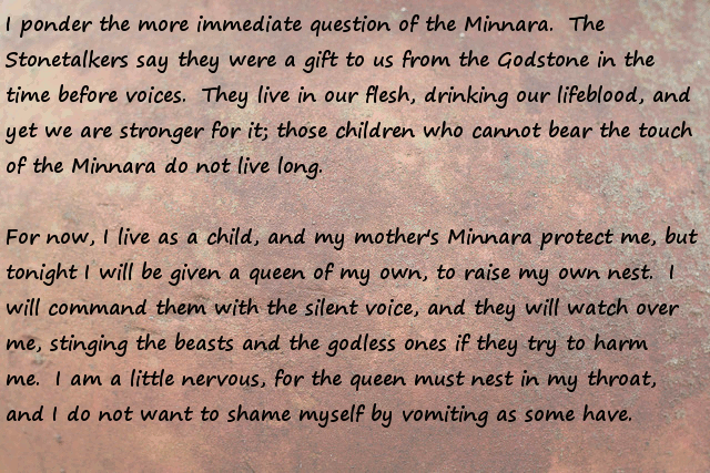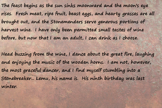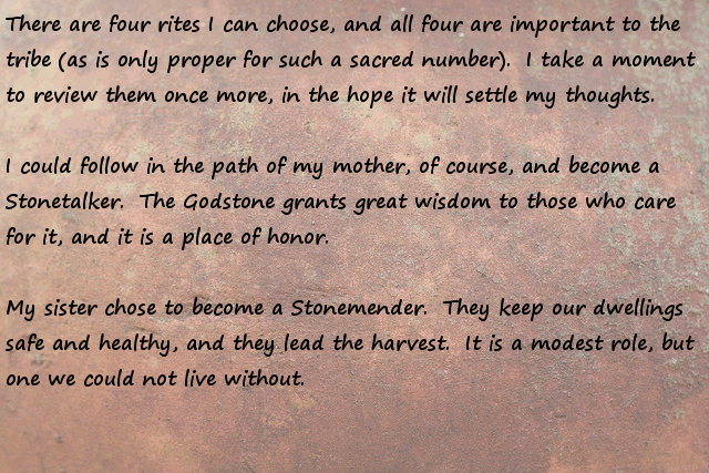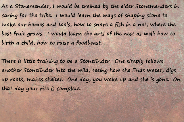 Stonemender = Worker villager, harvest fields, raise animals, be a midwife, etc... boring, safe, what most do... pass!
