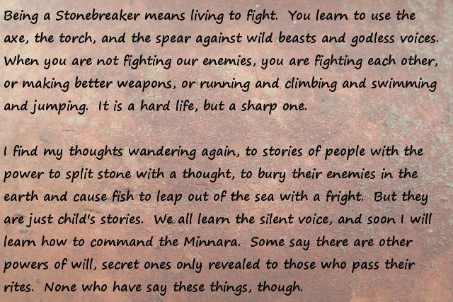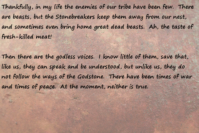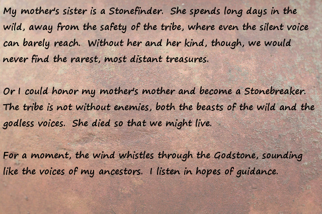 Stonebreaker = be trained to fight with a stonage axe and setting fire to enemy huts... This actually has some potential, become a great warrior, become a warchief, conquer many infidels and convert them to following the stone god.