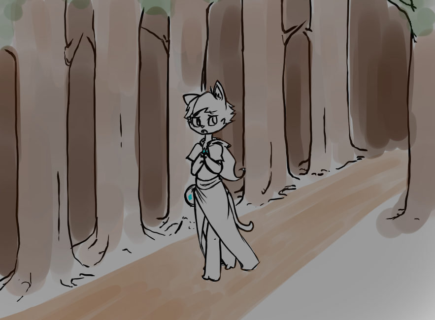 The two catfolk walk off down the path nearest to them, presumably towards the aforementioned village that they were talking about. The light from their torch grows fainter by the second as the pair get farther away.