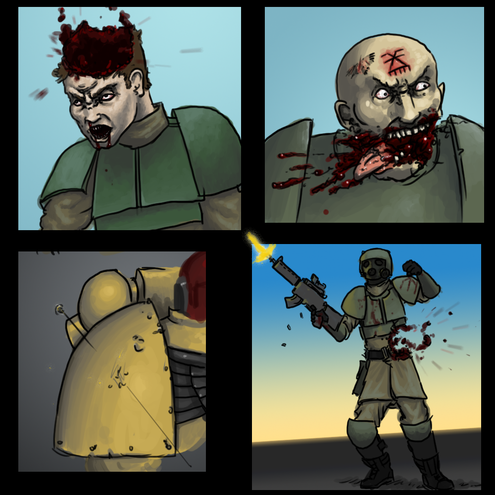 You aim out the window to the group of soldiers standing around. One turns around and notices you. He doesn't get to report your position, since your bolter did that job for him. The other job it did was send a bolt into the traitor's chest. His torso explodes, nearly decapitating him, and causing a mess of blood and gore where he falls.