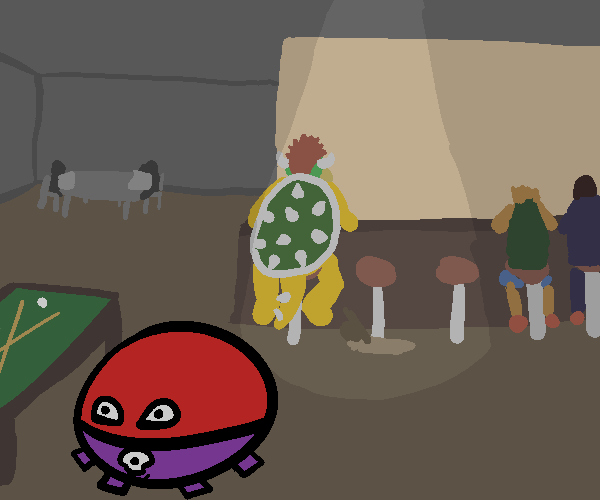 "HEY NICE OMINOUS DARK ARUA YOU GOT THERE. WHERE CAN I GET ONE OF THOSE BECAUSE I ALWAYS THOUGHT I WOULD LOOK COOL IN ONE OF THOSE. ALSO, I KNOW WHAT THIS IS ABOUT, THIS IS ABOUT THAT NEW BULLETBALL TABLE WE'RE GETTING INSTALLED IN THE CAFETERIA. THAT SHIT IS GOING TO BE AWESOME"