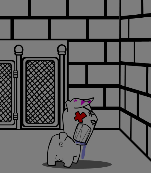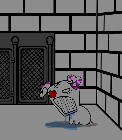 The room is large and bare, white painted brick, enough floor space to comfortably fit about a dozen of you or more. The only opening in the room are a large metal thing in the ceiling with slits that cool air (or warm air, it changes sometimes) comes out of, and the metal fencing at the front.