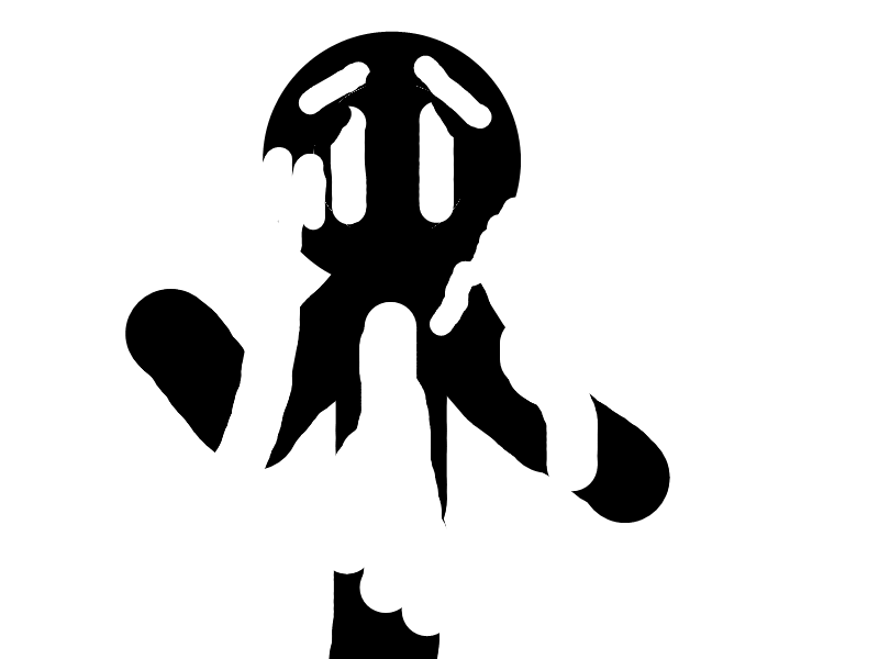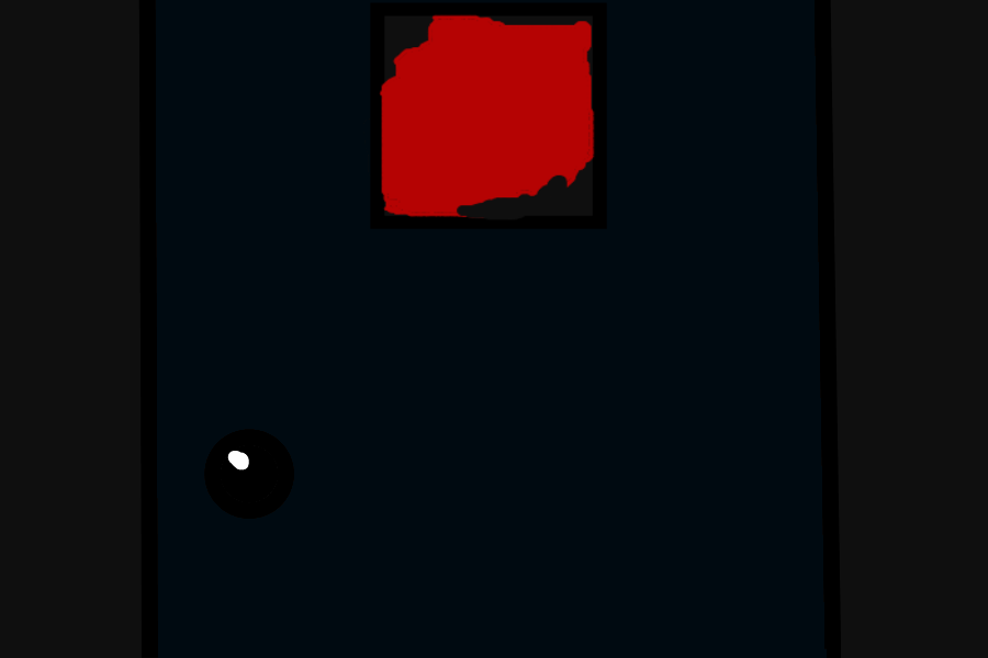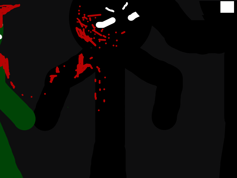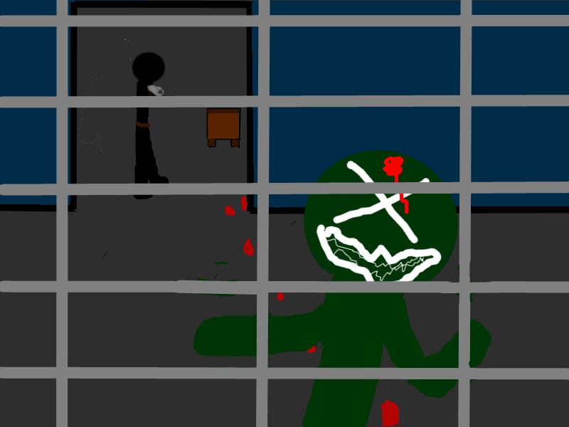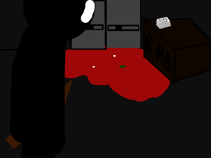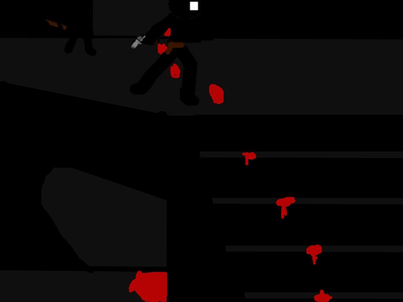 He freezes at the sight of bloody footprints going from the bathrooms to the left and into the stairwell in front of us.