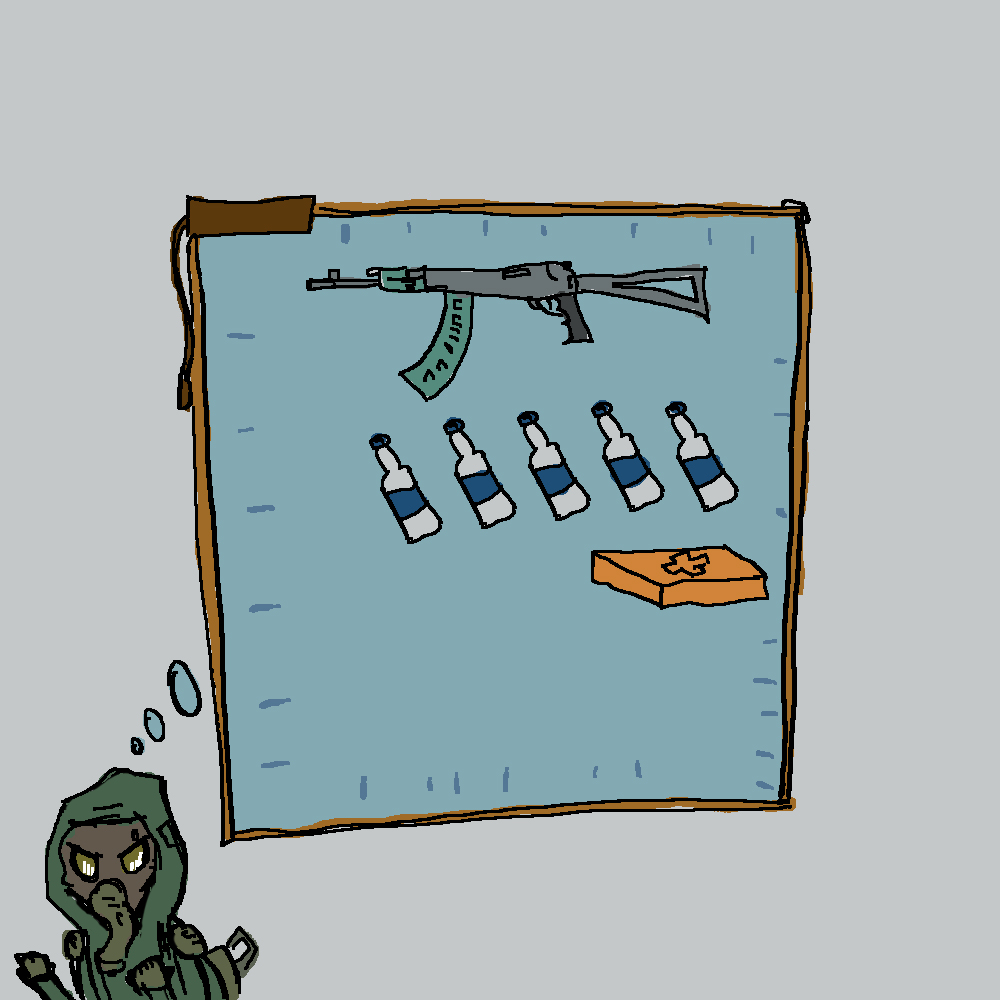 You have weapons. Weapon. Strapped to your back is your trusty AKM-72, and by trusty you mean to imply that it's in such a terrible condition that you don't expect it to protect you at all, but you hear that's how all guns are in The Zone. You have a total of one (1) medkit and a decent but perhaps not respectable amount of vodka. You have no ammunition except the ones in your weapon magazine.