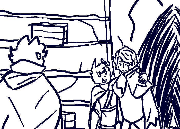"Tyfon, don't be a child," a member of the group, standing to the side, calmly interjects. The avian wears a fastened cloak. The supposed leader turns away from the fuming sangsaloj to face his insubordinate subordinate.