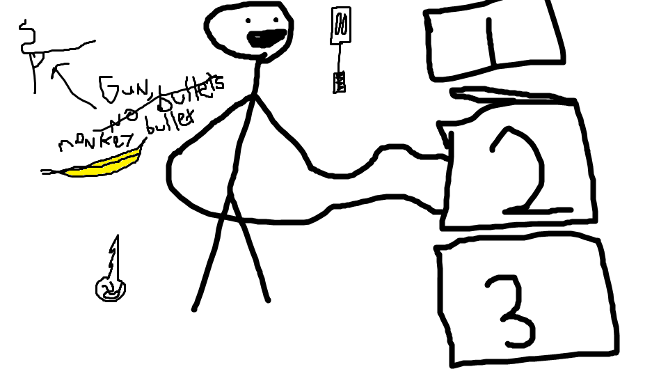 >>371238 You have a gun with no ammo, a banana, a spatula, and a key with some kind of symbol on it.