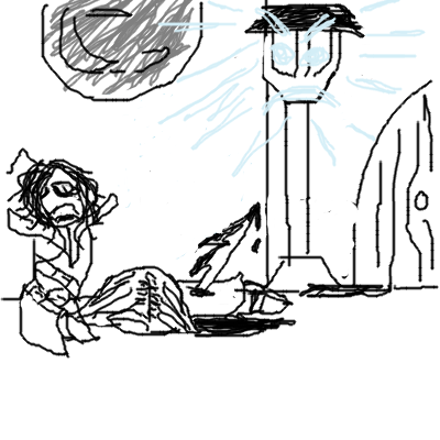 Looking through the hole the Skaab left, A Man stands far below, the juggernuaght's flaming broiled body made ash behind him.