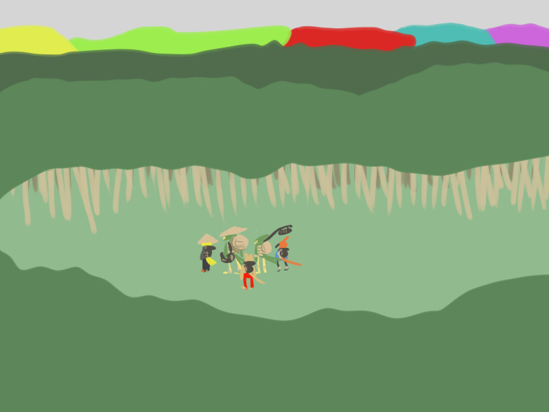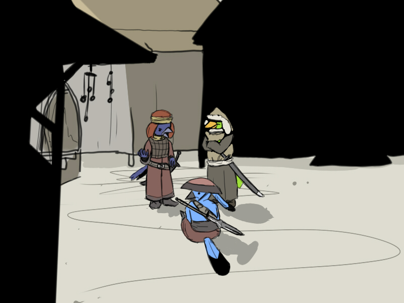He attempts to strike up a conversation with the warriors. They seem quiet, offering him, at best, a dim smile and a nod.