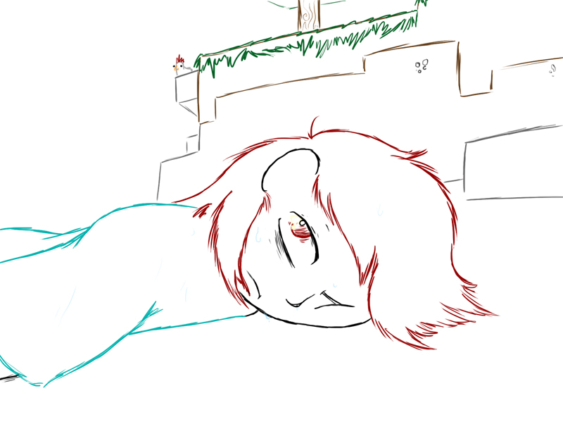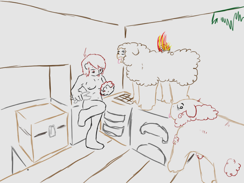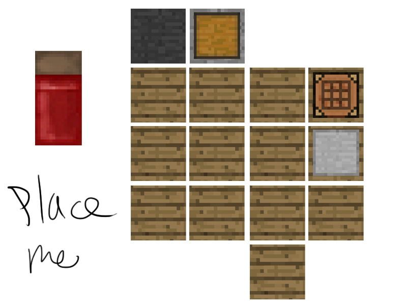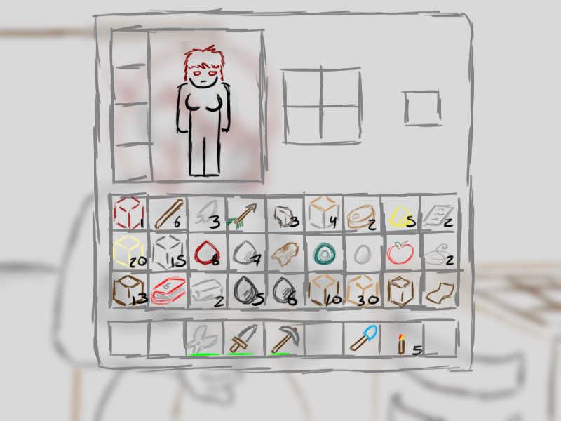 I have: 1 red fluff, 1 brown fluff, 6 sticks, 3 feathers, 1 arrow, 3 black rocks, 4 white logs, 10 brown logs, 30 planks, 20 sands blocks, 13 dirt blocks, 15 cobblestone blocks, 8 red dusts, 7 grey dusts, 5 yellow dusts, 2 irons, 1 leather, 2 strings, 5 coals, 6 charcoals, 1 egg, 2 porkchops, 1 apple, 1 zombie meat, 2 notes, 5 torches, my diamond shovel, a stone pick [60%] a stone sword [70%] sheers [95%] and the ruined book titled 6.