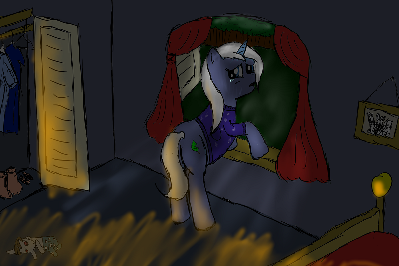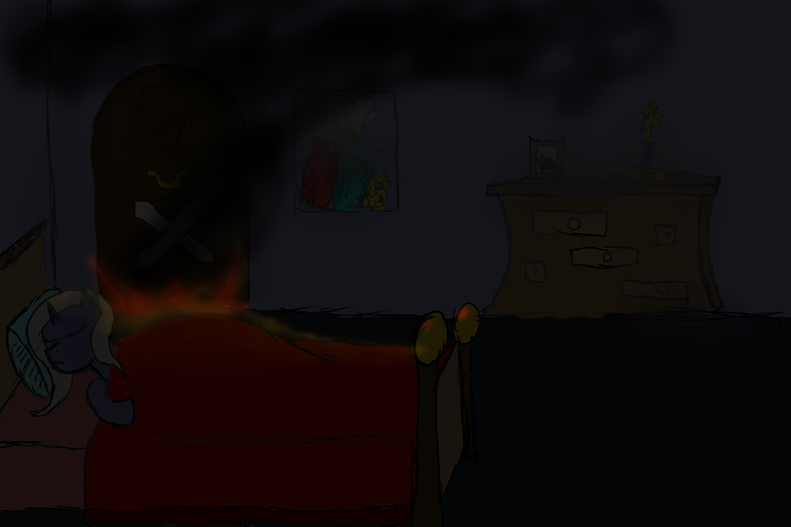 Heading out through the window is still the thing to do. If you go try and kick the door down or whatever, you're going to get a huge backdraft, a ton of smoke that'll choke you out, and/or set all your hair on fire, any given one of which would probably get you killed. So just shout that you're OK, recommend hopping out a window to your... mother? Sister? Whoever it is, and if they don't meet you outside, alert... the pony fire brigade, or whoever comes to stand around gawking, that someone is still inside.