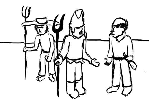You are met by two peasants armed with pitchforks, and an older man with an eyepatch. There is a sword strapped to his waist. Initially, they question the wisdom of bringing a jelly golem into battle, but when you volunteer to send her in first, they grudgingly agree. The older man points out to the others that, despite being a wizard, you're doing "real work," not "mucking about at gambling and magical cock-fights." This gets two affirmative grunts as a response.