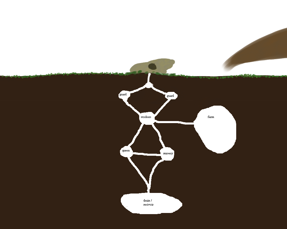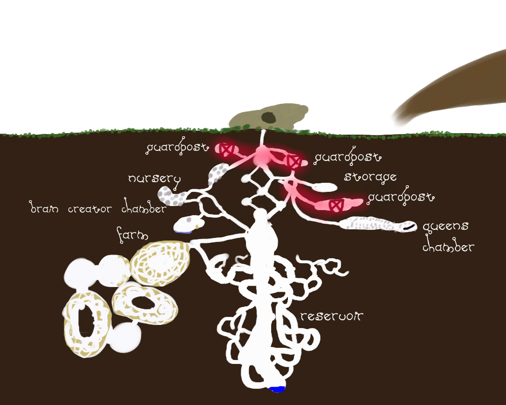 An assault tunnel! An amazing approach to a major offensive! We’re not thinking of connecting the attack tunnel to the interstate or the nest. The time consumed now only depends on how wide the attack tunnel should be? A one ant wide tunnel would be the fastest way. However, the amount of commando ants that can enter the sexy ant nest through this tunnel before the alarm is questionable. It would take three days to finish the one ant wide tunnel with as many ants digging it as possible while digging a wider tunnel only takes as much, but requires more soldier labour. Also, the closer the enemy nest the tunnel entrance is the faster it is to dig and the less it requires labour.