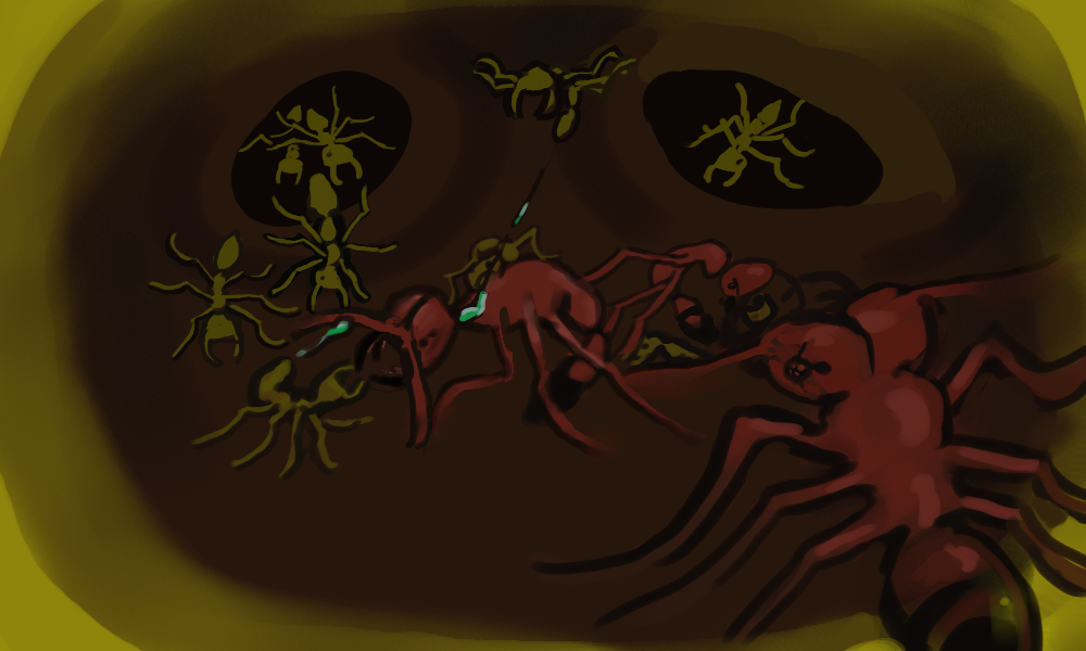 >"Oh shit! We dig this tunnel to praise our queen and then these yellow shits come in with massive numbers and shit! I- I think they're squirting venom! We're all gonna die, but at what cost! Should I inform the Queen or shout: DEAAAAATH!!!"