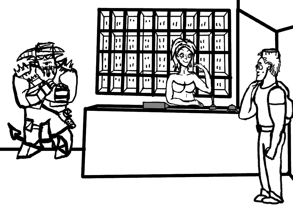 Grinn: Hmm. Allso on tha topic o' Guilders an' Furres: Tha Guilders usually stick to tha east side o' town near the Miner's Guild Barracks. It's oonly natural, thay knoow where the best mineral depoosits are in the system, so thay woork at tha Guild. As for tha Furres... Tha Resort is mostly for tha Furres. Not ta say tha Donald wouldn't give yew a room. But tha Bunk would be cheaper, even if Samantha's a sass.