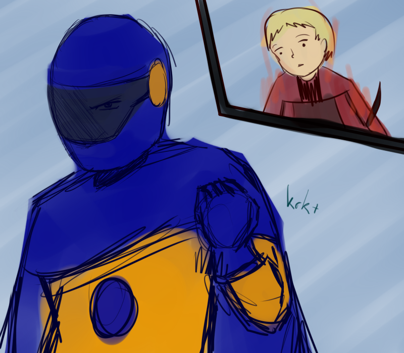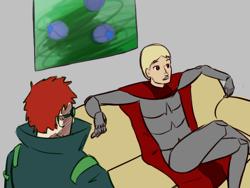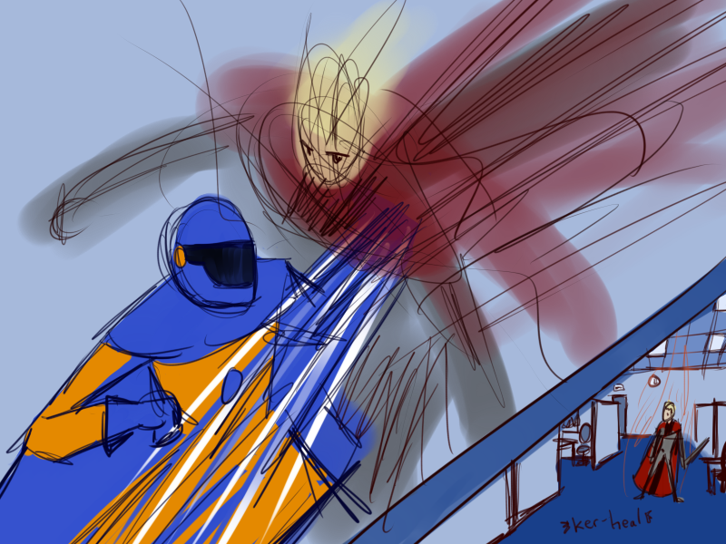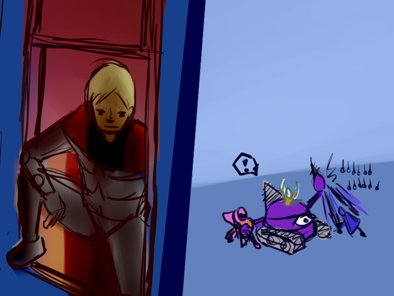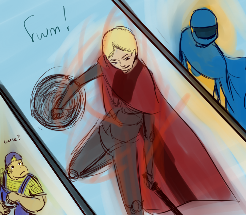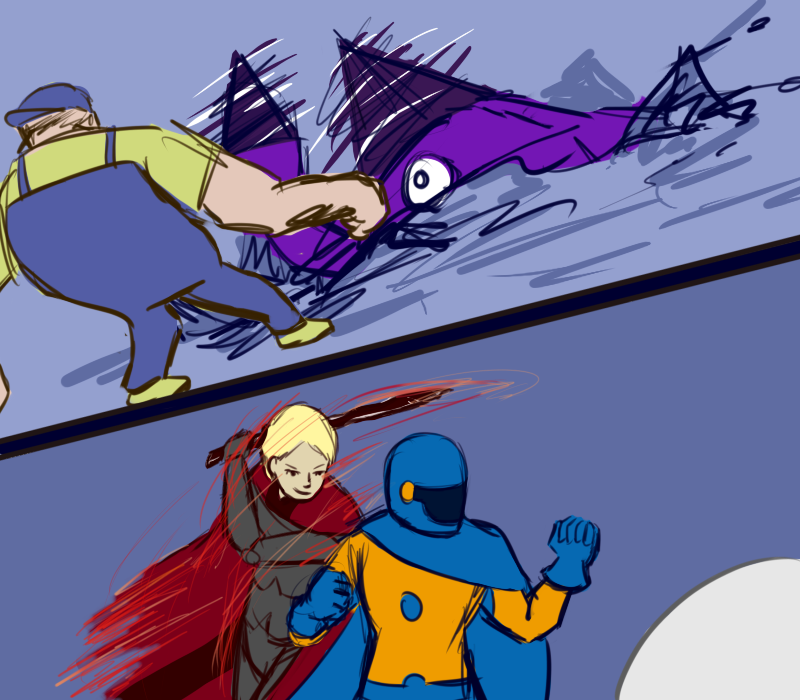 "Speaking of, that was quite a cheap shot earlier, wasn't it Blue? I suppose I shall have to teach you something of manners. First we greet each other - that's this part here - then we inquire after news of recent events for a few minutes - oh that Green - and THEN the cheap shot, like so!"