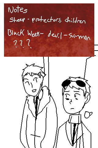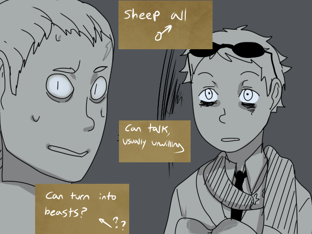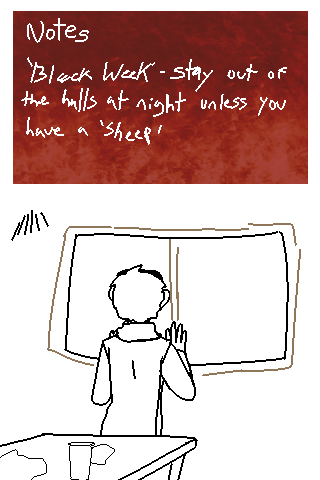 "Oh yeah, the only ones open during Black Week are the Student Council room, Drama club, and Science club. I'd avoid the science club if I were you. If you wanna hang back and see what's up tonight, there's a really violent sheep that hangs out around the pool. If the door hasn't been busted in, he probably hasn't started stalking anyone yet. But if you're gonna go get him, you can't hang out with us. That thing is a maniac. I heard that one time he ate a live goat. Like a bunch of kids threw a goat in the pool, and he totally ate it. There's this other crazy sheep that attacks students sometimes, but dude, a whole goat. Even the bones. That's the scariest shit I ever heard."