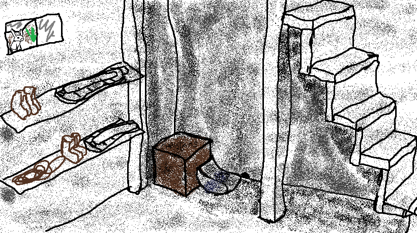 Upon closer inspection, Jerry finds that the bag says "Dog Food", there's a small whole in the corner of the bag. It looks as if some of the food has been taken out. It bothers him slightly that the whole in the bag is next to a small whole chewed into the wall. There is still plenty of dog food, however its quite bad, and he'd prefer something a bit more filling, if he's going to survive the winter off of it, but taking some wouldn't hurt. He just needs a way of carrying it, taking it bit by bit would take the whole night.