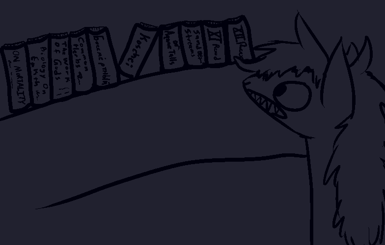 Knowledge that he is hoarding down here all to himself! We could be the last two things ever and he won't even let me touch a book?