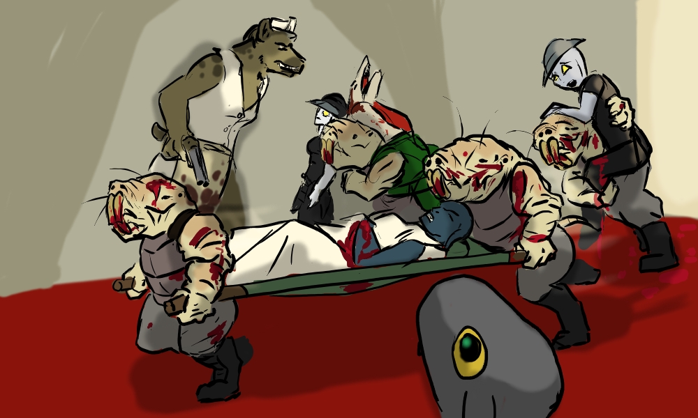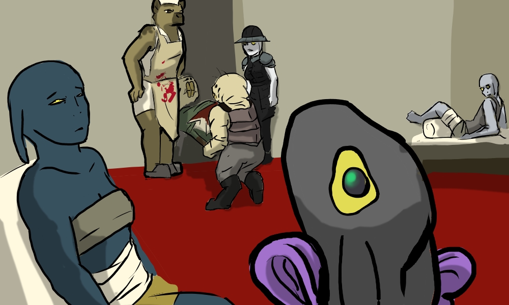 A few minutes later a truck drives up, it looks like that gang attacked one of the outlying farmhouses. Some really ugly things bring in the wounded; there's a goblin with a sword wound, another with a bullet wound in the leg, and a sergal they captured with a few bullet wounds! Veracity wants me to take the two goblins while she works on the captive! They both look like they're bleeding pretty bad!