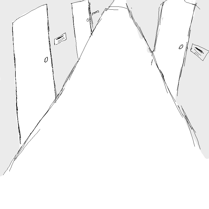 Well the clock should be right here, but it looks like it's gone now. There is also this strange writing. I can't recognize the handwriting. There are some doors down this hallway, but it is still so quiet, have all the teachers gone home? I'm kind of scared, should I keep going or just go back inside the bathroom? At least I felt kind of safe there...