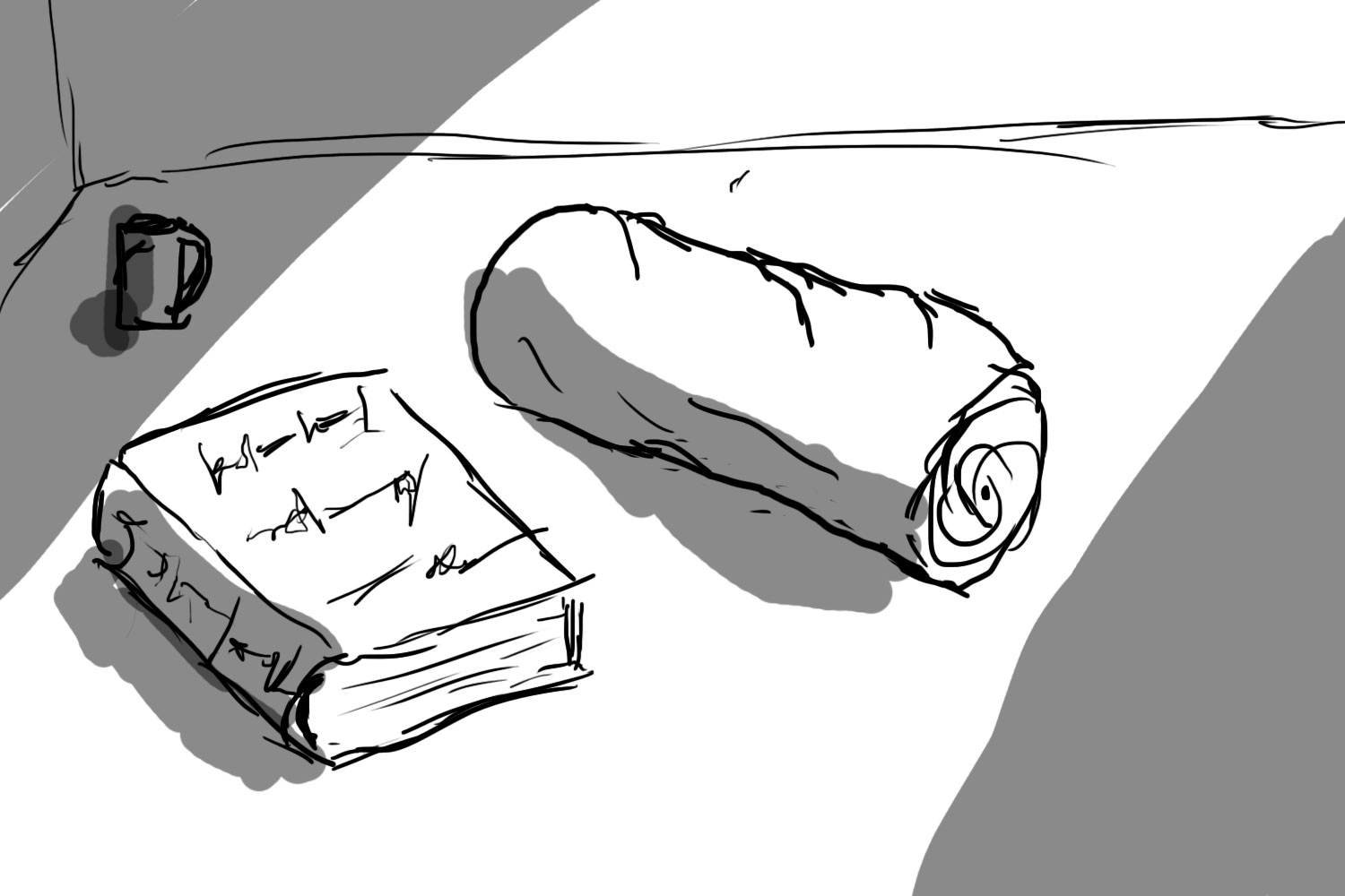 To my left, a book in again, an unfamiliar language. A metal mug. A bundle of blankets. My wound seems tended to but I can't reach that plate of food without extreme pain.