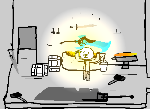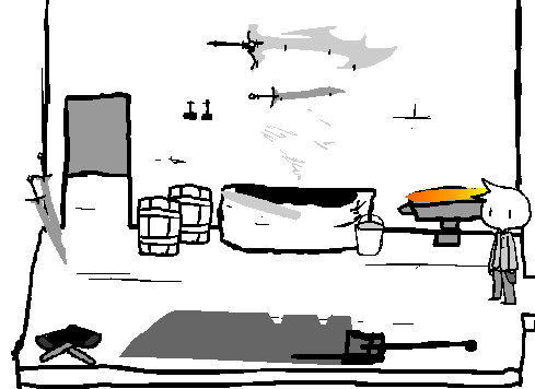 You could probably get a lot of this junk from town just east-ward from the smithy, finding a sword in a smithy sounds really easy too, so easy, you might have to use that as a metaphor somewhere. You make a mental note.