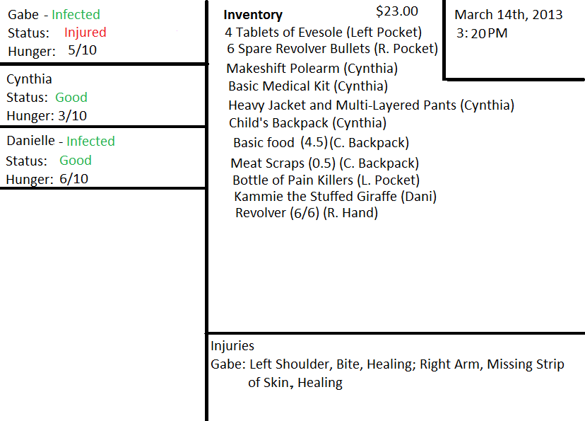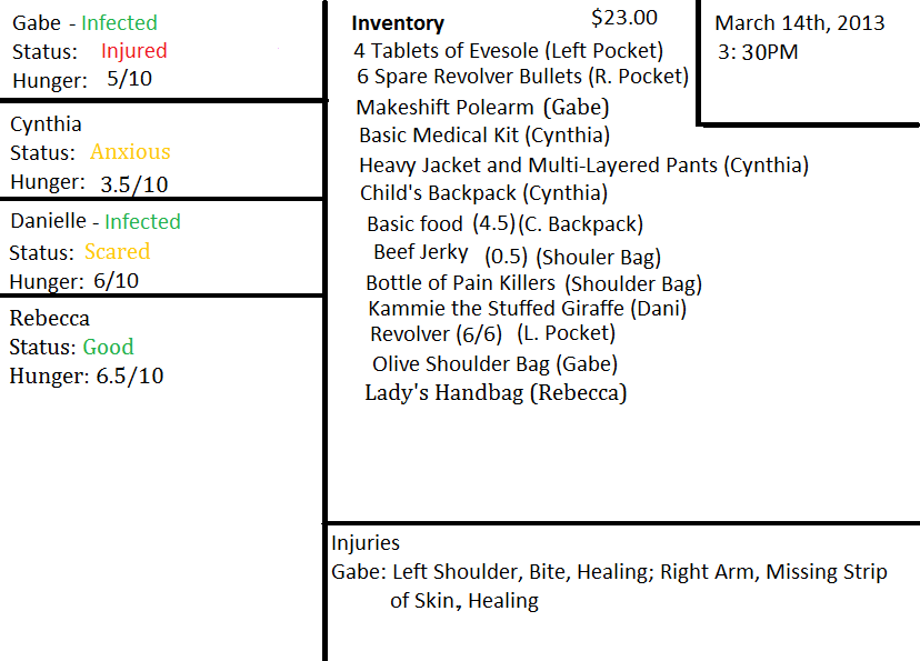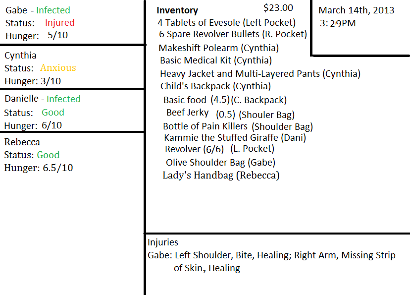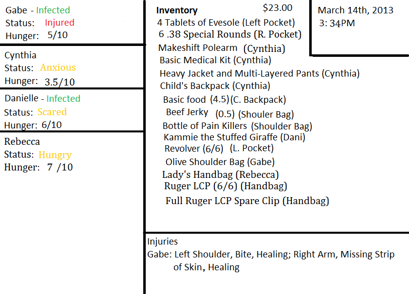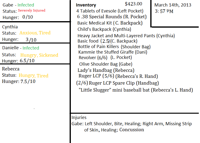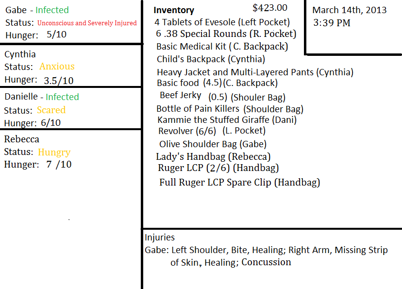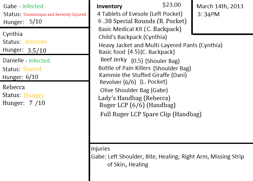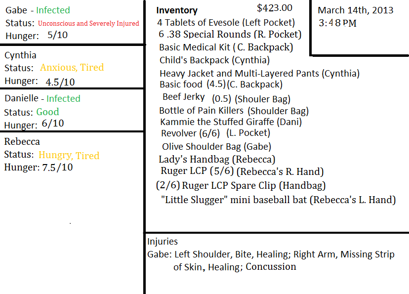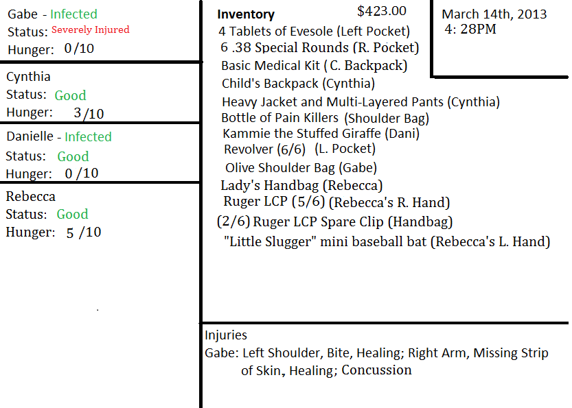 “I'll bring you something here right quick,” he says to assuage her desire. “Cynthia, would you go fetch me a Frisbee or something?” She nods and hurries off back into the store, while Rebecca finishes coaxing Dani out. The little one's eyes never leave the pair of corpses.