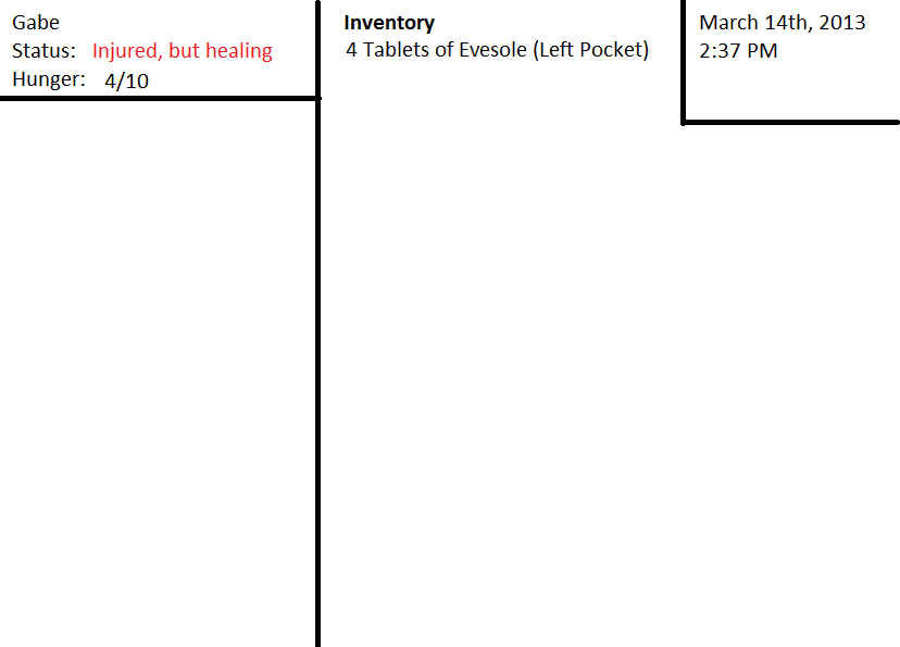 The thing has been pounding on the door for days now, never letting up for a moment. Thank god this apartment has sturdy doors. For once, Gabe is glad this area had so much crime. But even having normalized to the noise that usually surrounds his appartment, he still couldn't sleep well the past few nights. The TV was still playing the same generic message as of a couple hours ago. Things are still under control. Stay indoors, let no one in. Everything will be solved on the 12th, it promised. Yeah, well that was two days ago, and Gabe is starting to run out of food... and of his medication. He only has four doses left, and has decided to save them for when he needs a clear head. For now, he needs to worry about the food situation- while he still has strength to worry with.