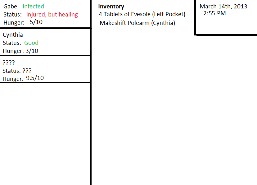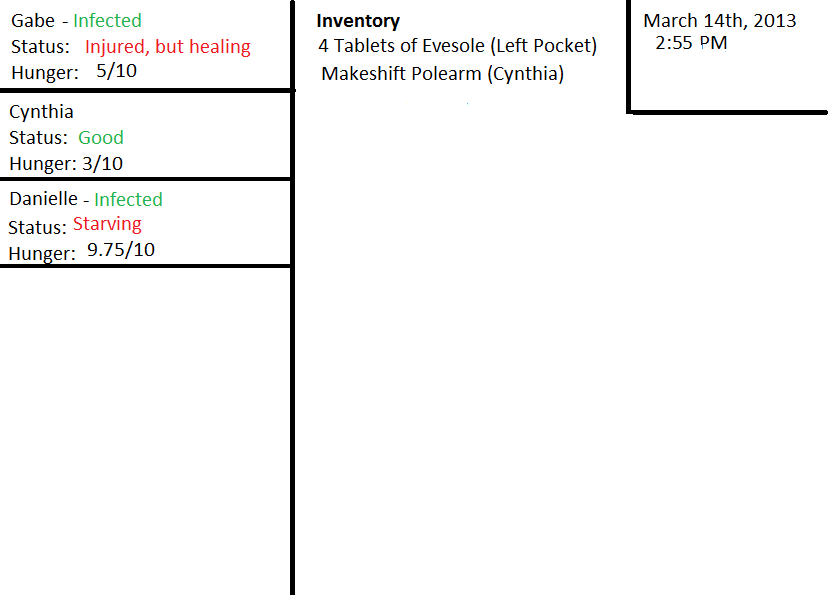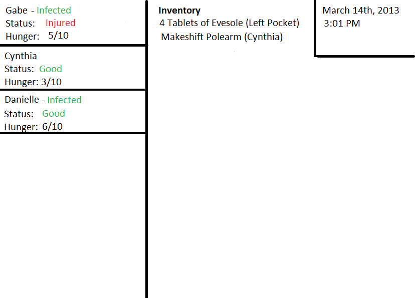 Gabe signals her down, and tries to wave the group forward, readjusting his hold on Dani. The child has covered her eyes and buried her head into Gabe's chest- he can feel her sharp breaths against his wounded shoulder. Cynthia and Rebecca seem to get it, and speed up a little. Gabe keeps his eye on the alert zombie, but luck seems to favor the group. As the victorious undead rips his first bite from the poor rodent, a spray of blood is thrown into the air- and right into the alerted one's nostrils. He immediately dive tackles his once again opponent, and the group makes a clean get away.