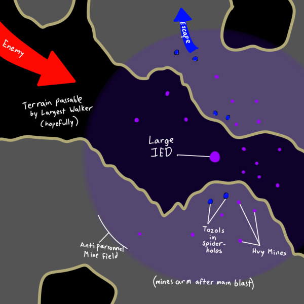 "We pop out of spiderholes and move in, obviously," says Rinis. "We can finish off the big walker that way. Break in, kill the crew, leave before the smoke disperses."
