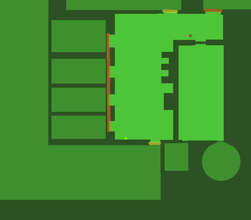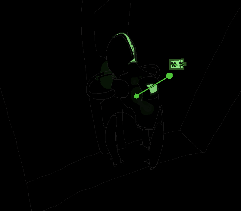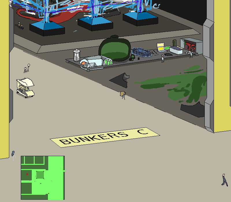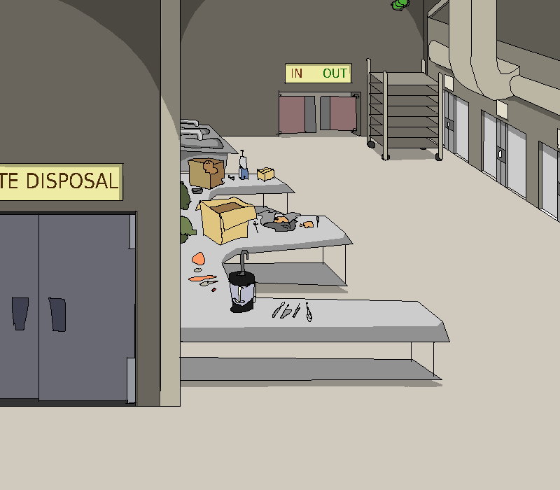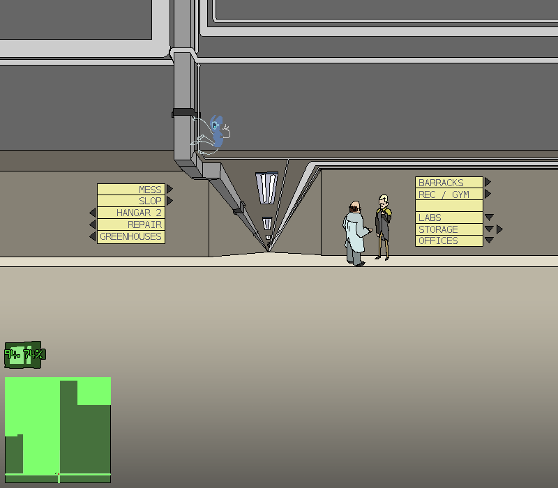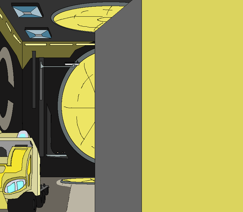 You gradually clamber along the ceiling fixtures, making your way to the end of the hallway and surveying the surroundings. Far ahead of you in the distance, the last of a few vehicles of... some kind... are disappearing up a massive metallic ramp. Armored and uniformed bodies flit between and behind them, and through the various doors and hallways that you can see open up to this larger corridor.