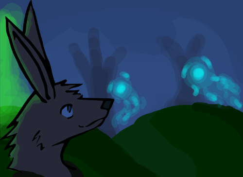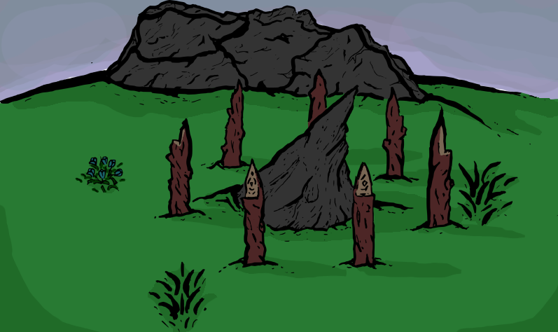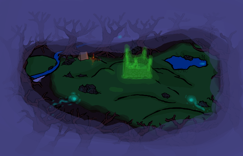 Taking a little while to examine the clearing, a couple of useful points are found. Most importantly near the center is what appears to be the nexus of the fount, a rough rock formation sticking out from the crest of a hill. Also, there is a pond in which you strongly suspect are a fair number of fish that you could catch.