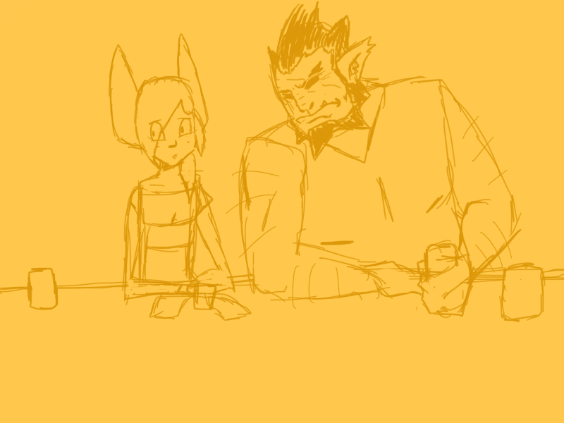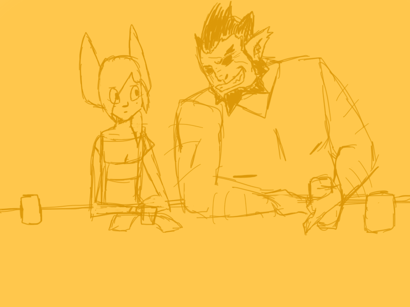 >Heh, yeah, that's more like it! Barkeep! Two orders of whiskey, pronto!