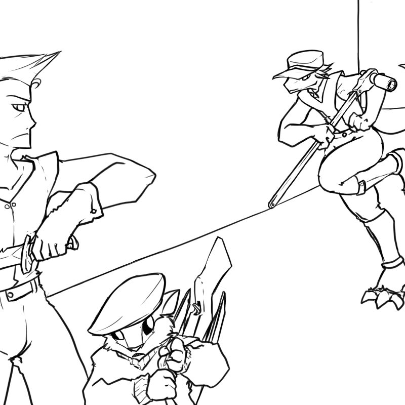 Coyote rushes up as well, lashing out with his knife. Klip attempts to hop out of the way, but his blade finds purchase in her pants as well!