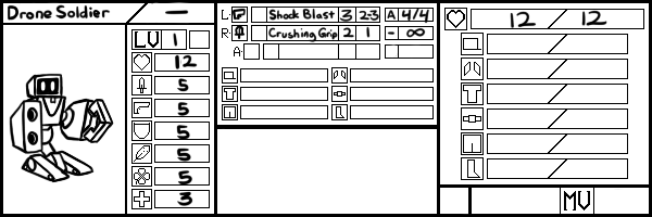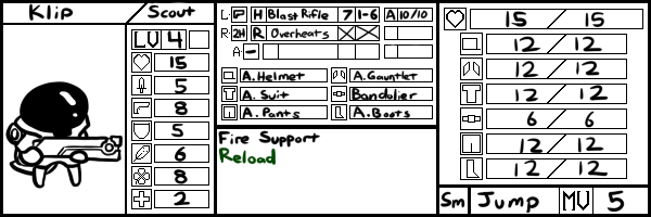 Klip turns and fires her rifle at Hinzes, but her aim is off and the shot does fairly little damage, singing her pants and boots. Hinzes responds to the shot with a burst of nails, dinging off of Klip's Helmet and doing 3 damage.