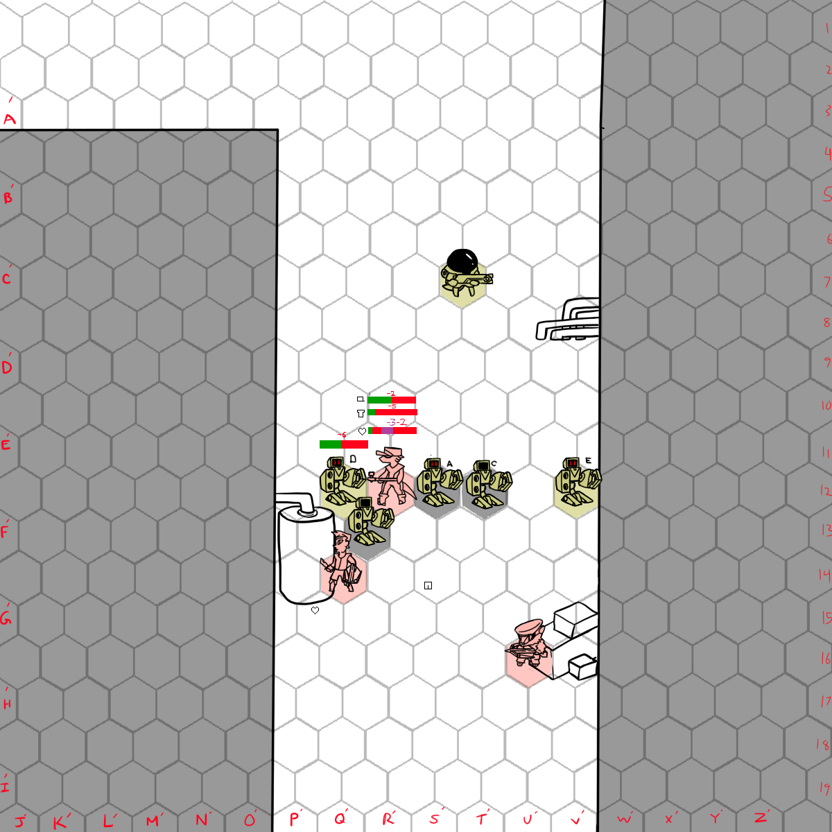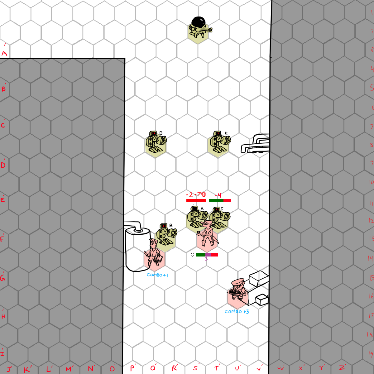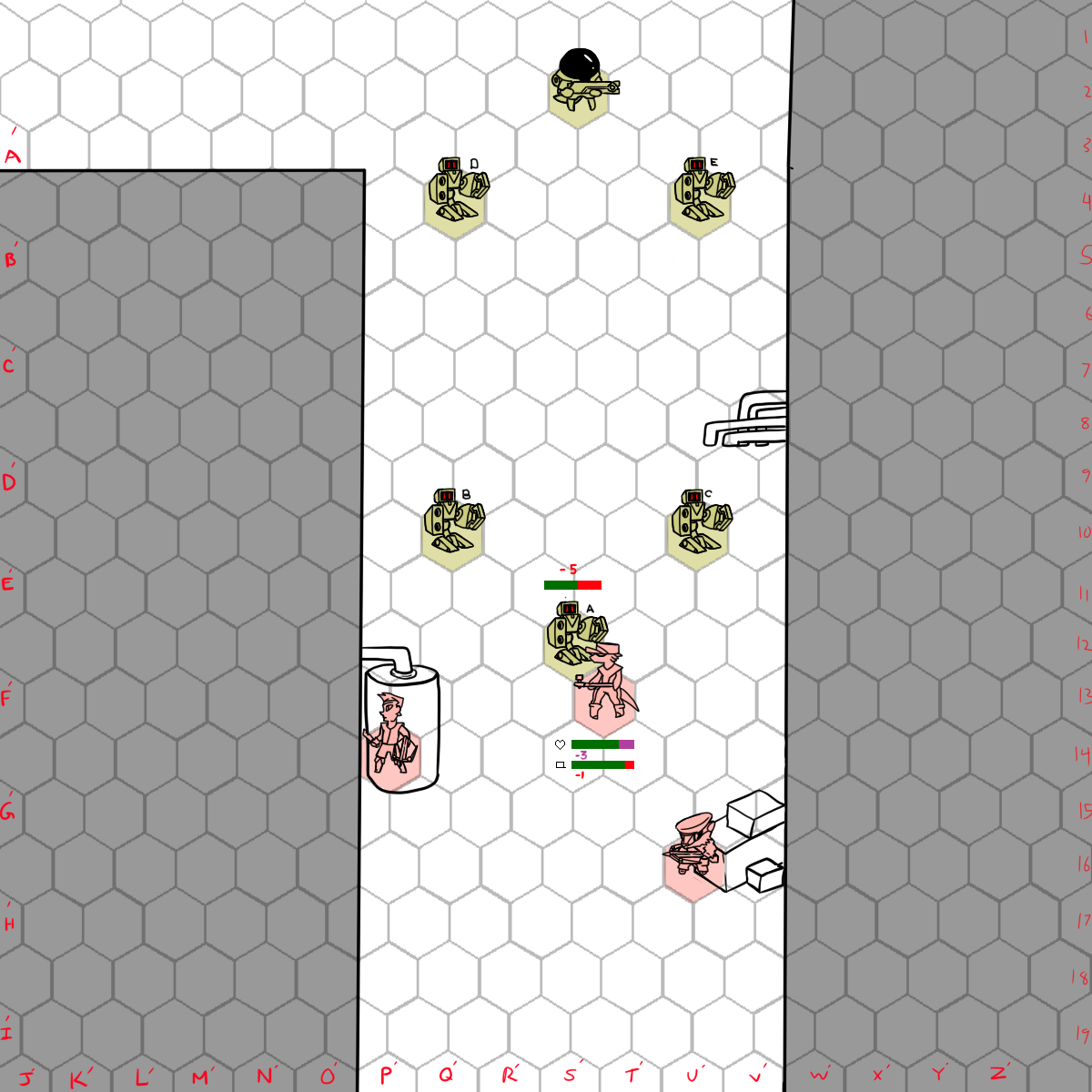 Hinzes can move to N10 on her turn and use her nail gun to get Kilp's attention so both Coyote and surt can move up on there next turns.